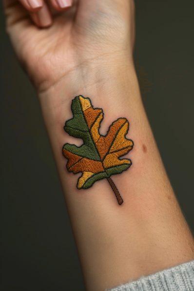 Honestly, I love how this design feels like a little piece of fall you can carry year-round. The embroidered style is such a creative twist it s not something you see every day, and it adds an artsy flair that feels personal. If you re into nature-inspired tattoos or just want something that ll have people asking, Wait, is that really a tattoo? this is the one. It s quirky, beautiful, and downright impressive.