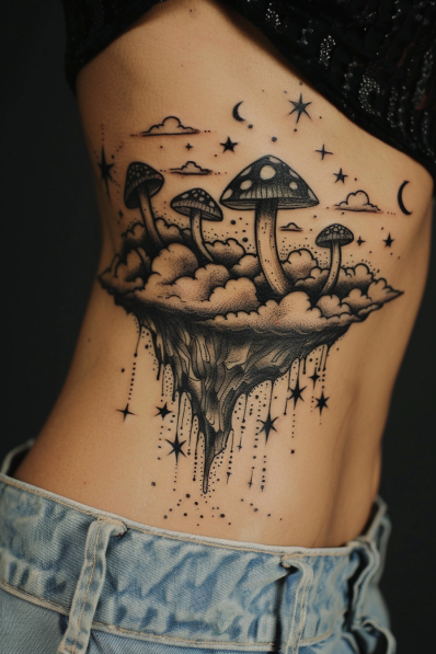 This dreamy tattoo features a floating island of mushrooms nestled in a bed of clouds, surrounded by stars, moons, and tiny celestial details. The design is done entirely in black and grey ink, giving it a soft, ethereal quality. The large mushroom in the center draws attention with its perfect shading, while smaller mushrooms add balance and depth to the floating island. Dripping clouds and stars below give the tattoo a surreal, magical feel, almost like a tiny piece of another world is hovering just below the skin.
