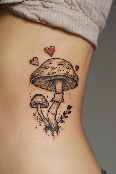 This charming tattoo features two mushrooms standing side by side, surrounded by adorable little hearts. The larger mushroom has a textured cap with delicate shading, while the smaller mushroom mirrors its companion in a slightly simpler design. The addition of small hearts floating around gives the tattoo a sweet, whimsical vibe, as if these mushrooms are part of a little love story. The fine line details and soft, muted colors make the overall design feel gentle and endearing.