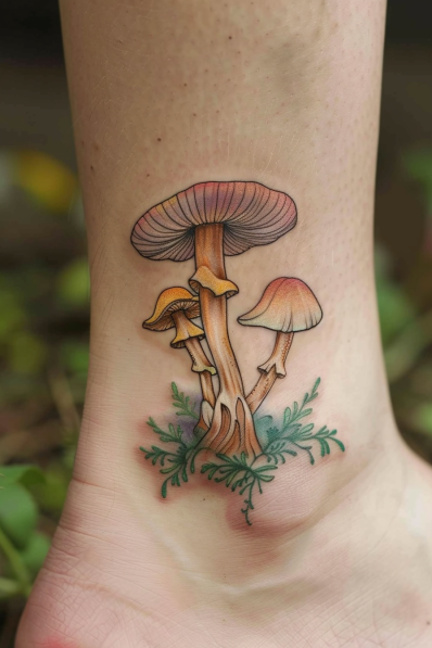This charming tattoo showcases a delicate cluster of mushrooms growing gracefully along the ankle. The soft pastel tones of the mushrooms, with their creamy caps and light orange shading, create a subtle yet beautiful design. The slender mushroom stems rise from a small patch of greenery, giving the tattoo a natural and organic feel. The simplicity and clean lines of this piece make it perfect for anyone who loves nature-inspired tattoos but prefers a more minimalist style.