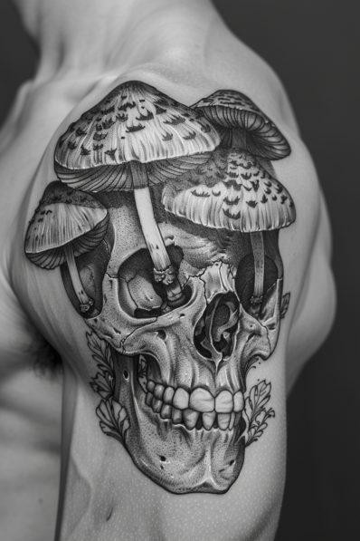 This bold and intense tattoo combines the imagery of a realistic skull with a cluster of mushrooms growing right out of the top, creating a striking visual contrast between life and decay. The shading on the skull is immaculate, with detailed linework giving it a gritty, lifelike texture. The mushrooms, with their thick caps and detailed gills, add an organic touch, as though nature is reclaiming the skull. The placement on the upper arm amplifies its impact, making this design an attention-grabber for sure.
