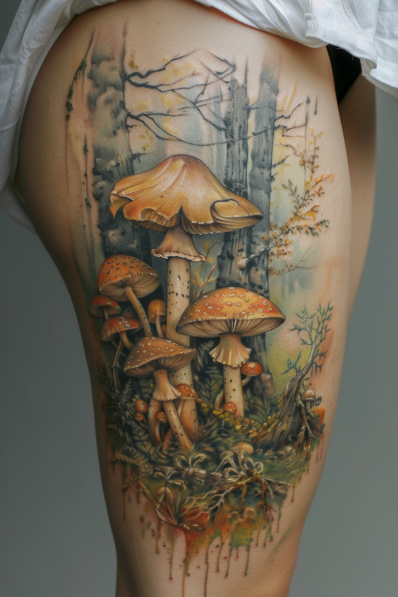 I m really digging this design because it feels like something straight out of a fairy tale. The realism of the mushrooms makes it stand out, and the way the background blends into the skin gives it that soft, ethereal look. If you re a nature lover or just appreciate a well-done, earthy design, this tattoo is a total winner. Plus, I m all for anything that makes it feel like you re walking through an enchanted forest on your thigh, no less!