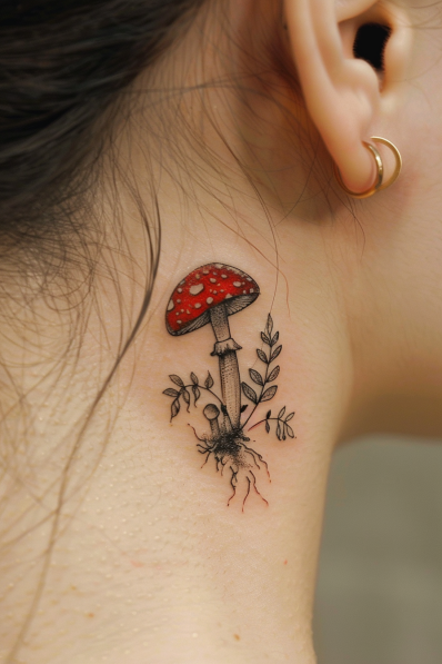 This adorable behind-the-ear tattoo features a tiny fly agaric mushroom with its iconic red cap dotted with white spots. The mushroom is carefully detailed, and its small roots appear to be growing right from the skin. A few delicate leaves surround the stem, adding a touch of nature to the simple yet charming design. The placement behind the ear makes this tattoo a subtle but fun way to express your love for mushrooms and nature without being overly flashy.