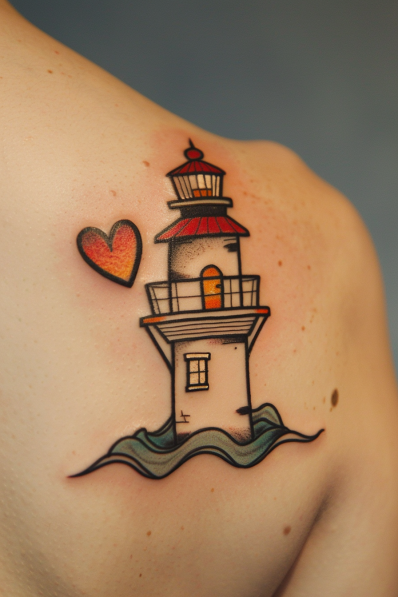 This charming tattoo features a brightly colored lighthouse standing tall above soft, rolling waves. The red and orange tones of the lighthouse, paired with the cute little heart floating beside it, create a warm and inviting vibe. The bold black outline gives it a clean, cartoon-like style, while the minimalistic waves add just the right touch of motion. Placed on the shoulder blade, it s a playful yet meaningful nod to travel, guidance, and finding your way.