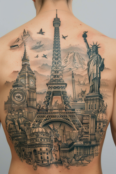 This breathtaking full-back tattoo is a masterpiece, showcasing some of the world s most iconic landmarks. The Eiffel Tower stands tall in the center, surrounded by Big Ben, the Statue of Liberty, the Colosseum, and more, all woven together in a beautifully detailed collage. Airplanes and birds fly across the sky, adding movement and a sense of freedom, while a distant mountain anchors the design with a natural touch. The black and grey shading brings depth and realism, making this tattoo a true tribute to global exploration.