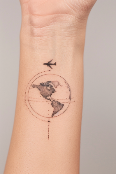 This delicate wrist tattoo features a simplified world map inside a thin circle, with a small airplane flying above it. Dotted lines give the design a modern, geometric touch, while the tiny compass detail at the bottom adds a subtle nod to navigation and exploration. The fine-line artistry makes it minimalist yet packed with meaning, perfect for someone who values sleek, understated designs with a personal twist.