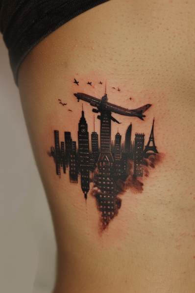 Skyline and Airplane Travel Tattoo