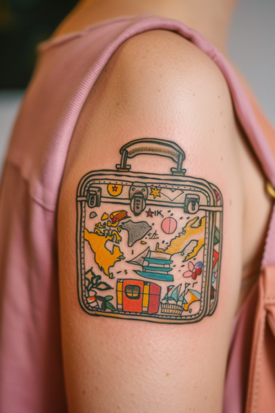 I can t get over how fun this design is! It s like a mini storybook of your travel dreams packed into a suitcase. The bold colors and quirky details make it stand out, and honestly, it gives off major adventure awaits vibes. If you re someone who packs their bags at the first sign of a good deal on flights (or even just daydreams about it), this tattoo is basically your spirit animal. Seriously, what s not to love?