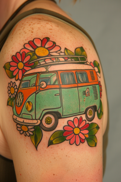 This lively tattoo features a vintage camper van in a vibrant mint green and orange color palette, surrounded by cheerful daisies and lush green leaves. The retro-style van, complete with a roof rack, embodies the spirit of road trips and adventure. The bold lines and bright colors give the design a fun, cartoon-like vibe, making it a perfect homage to carefree travel and the open road. Positioned on the shoulder, it s a bold and nostalgic statement piece.