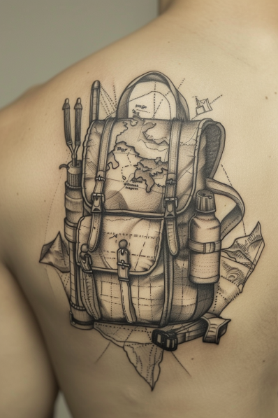 This masterpiece of a tattoo features a rugged travel backpack complete with intricate details like straps, buckles, and essential travel gear. Tucked into the design are a folded map, a compass, and a water bottle, while a world map is etched across the front of the backpack itself, tying the whole theme together. The black and grey shading brings a realistic, three-dimensional look that practically makes you want to reach out and grab it. Placed on the upper back, it s like carrying your wanderlust wherever you go.