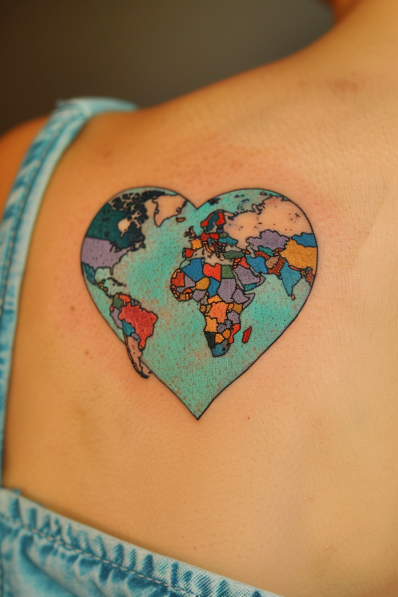 This colorful tattoo transforms a detailed world map into a heart-shaped design, symbolizing a deep love for travel and global exploration. Each country is outlined and filled with vibrant hues, creating a mosaic-like effect that makes the tattoo visually striking. The soft turquoise background adds a harmonious touch, making the colors pop even more. Placed on the upper back, this tattoo is a bold and beautiful declaration of wanderlust.
