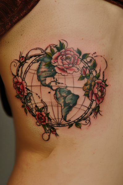 This stunning tattoo combines a vintage-style globe with blooming roses, intertwining travel and beauty in a truly artistic way. The continents are outlined in soft teal, while the roses add vibrant pinks and reds, creating a colorful yet balanced design. The fine details of the globe s grid and floral elements give it a delicate, almost watercolor-like touch. Placed on the side of the body, this tattoo commands attention without being overly flashy.