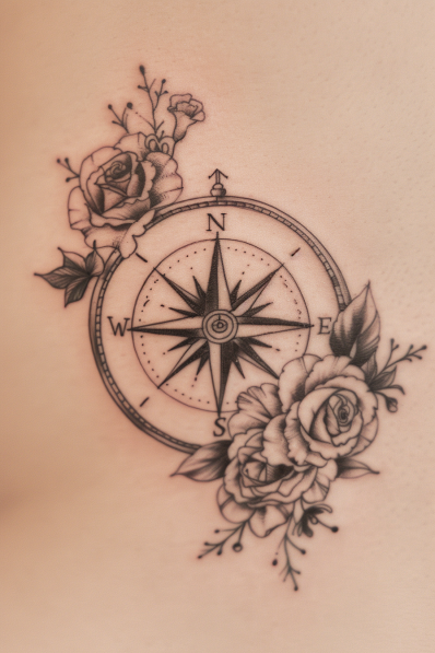 This elegant tattoo features a classic compass design surrounded by beautifully detailed roses. The black and grey shading brings a timeless feel to the piece, while the delicate petals add a touch of softness and romance. The compass, a universal symbol of guidance and exploration, anchors the design, making it perfect for anyone whose heart is set on adventure. Positioned on the side, this tattoo flows naturally with the contours of the body, giving it a graceful and polished look.