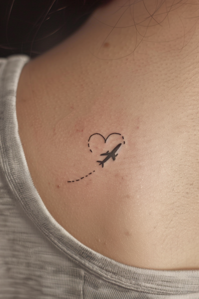 This adorable tattoo features a minimalist airplane soaring through the sky, leaving behind a dotted trail that forms a heart. Placed on the upper back, it s small, sleek, and subtly charming. The clean lines and simple design make it perfect for travel enthusiasts who want something discreet yet meaningful. The heart adds a touch of sentimentality, symbolizing a love for adventure and exploring the world.