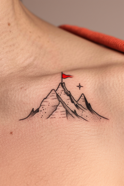 This minimalist tattoo features a trio of rugged mountain peaks, crowned by a bold red flag at the summit. The fine black ink detailing gives the design a clean and timeless look, while the tiny red flag adds a pop of color and a sense of accomplishment. A delicate star shines nearby, symbolizing guidance and dreams. Placed just above the collarbone, this tattoo feels personal and quietly powerful a perfect nod to conquering challenges and embracing adventure.
