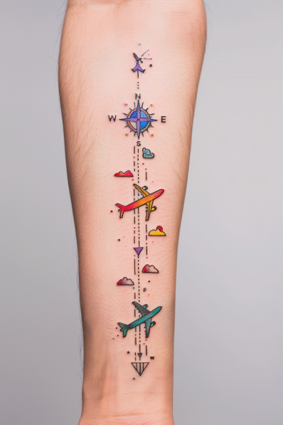I m absolutely loving the storytelling in this tattoo! It s not just an arrow; it s a roadmap of your wanderlust. The tiny travel icons are such a fun way to personalize the design they make it feel unique and specific to someone s journey. And let s be honest, an arrow pointing forward is just the right vibe for anyone with a restless spirit and a suitcase always packed. It s bold, meaningful, and definitely a head-turner. I d say this tattoo is a total win for adventurers!