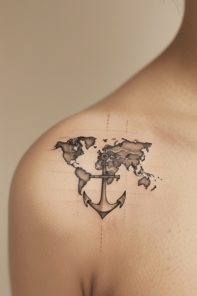 This minimalistic yet powerful tattoo features a finely detailed world map resting above a classic anchor. The clean black ink and sharp lines create a modern look, while the dotted grid adds a cartographic feel. The anchor symbolizes stability, paired beautifully with the map to represent a love for travel and finding one s grounding no matter where in the world you go. Placed on the shoulder, it s a subtle but deeply meaningful design.