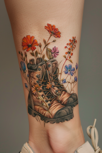 Hiking Boots with Wildflowers Tattoo