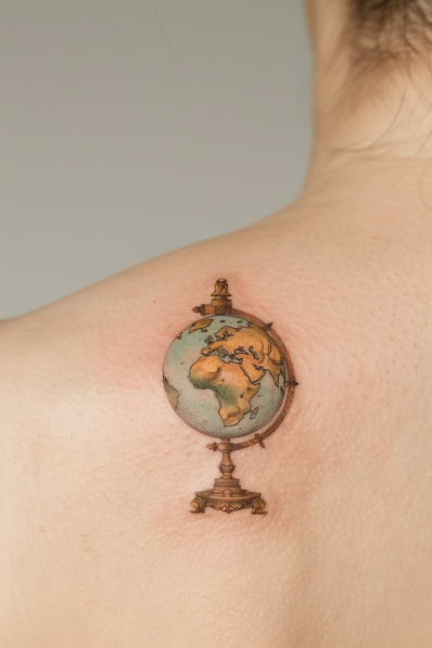 This elegant tattoo features a beautifully detailed vintage globe, showcasing the continents in warm golden hues with soft blue oceans. The design is perched on a classic globe stand, giving it a timeless and scholarly feel. Its placement on the upper back makes it small and subtle yet visually striking. The muted color palette adds a sense of nostalgia, perfect for someone with a passion for both history and exploration.