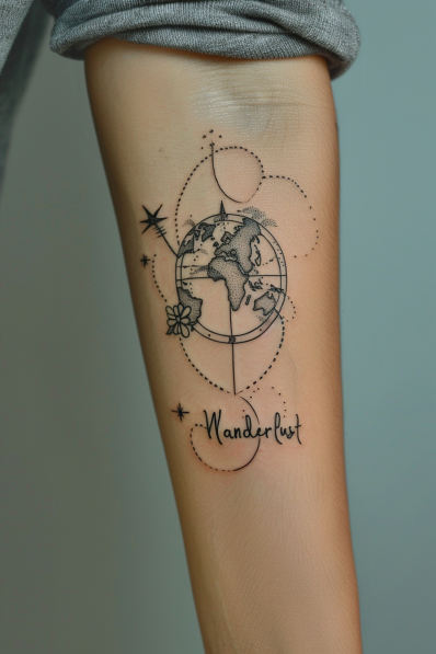 This delicate tattoo features a minimalist globe with the continents intricately dotted into the design. Surrounding the globe are soft dotted lines forming loops, stars, and a tiny compass rose, evoking the sense of adventure and exploration. The word Wanderlust is elegantly written beneath the globe, tying the whole design together with a personal touch. The placement on the forearm makes it a perfect everyday reminder of a love for travel and discovery.