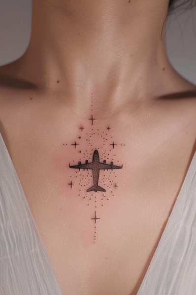 This stunning tattoo places a detailed airplane front and center, surrounded by a constellation of delicate stars and dotted lines that create a celestial feel. The minimalist design perfectly captures the magic of flying under the night sky. Positioned elegantly on the upper chest, the tattoo draws attention to its ethereal beauty while staying clean and understated. The vertical alignment adds a sense of motion, as though the plane is soaring through a galaxy of dreams.