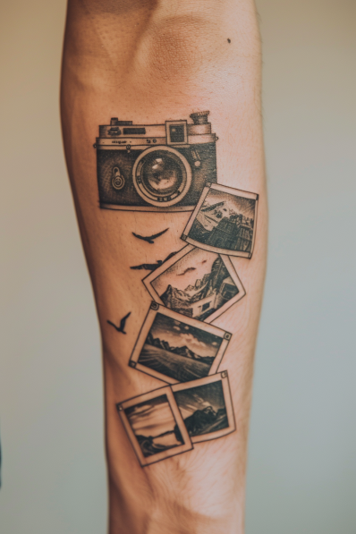 This tattoo tells a story in motion, starting with a retro film camera that s snapping a cascade of Polaroid-style photos. The photos feature scenic landscapes majestic mountains, serene lakes, and vast skies creating a visual diary of unforgettable travel memories. The intricate detailing on the camera and the shading on each photo make this design incredibly dynamic, as if the images are coming to life. Placed on the forearm, it s a perfect display piece for someone who loves capturing their adventures.