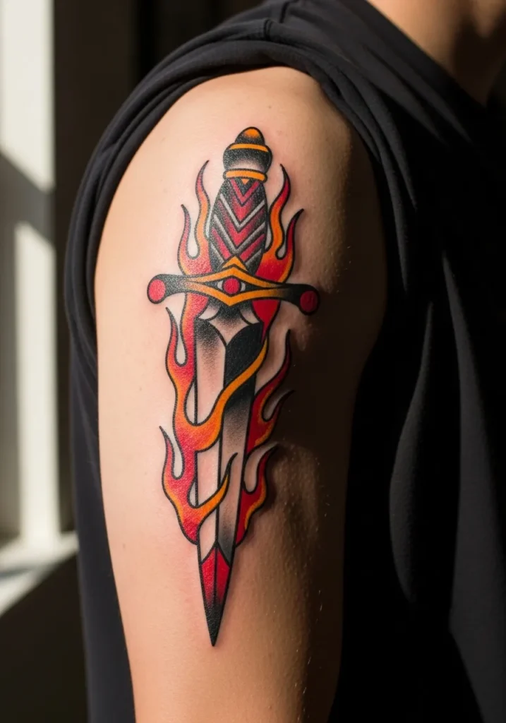 This upper arm tattoo turns up the heat with a dagger surrounded by bright red and orange flames. The blade is sleek and shaded in black and gray, while the handle bursts with yellow and red highlights. The fire wraps around the dagger naturally, creating movement and a fiery sense of drama.