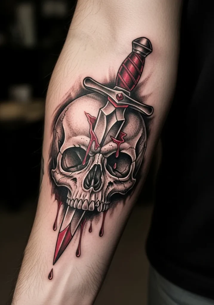 This dramatic design takes center stage on the forearm, showing a dagger plunged through a skull with drops of blood dripping from the blade. Shades of red, black, and gray give the piece its depth, while the detailed bone texture and clean lines make it unforgettable. It s bold, dark, and full of that rebellious old-school attitude.