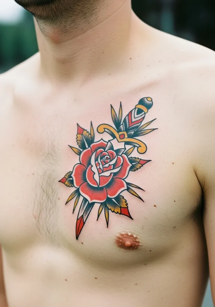 Rose and Dagger Chest Tattoo Design