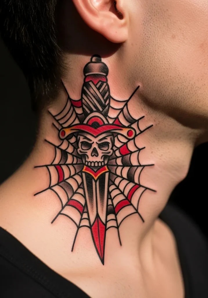This daring tattoo sits along the side of the neck, combining a dagger, a grinning skull, and a detailed spider web background. The design uses rich reds, blacks, and golds to create contrast, and the placement makes it impossible to miss. Every line is clean and confident, showing off the true boldness of the American traditional style.