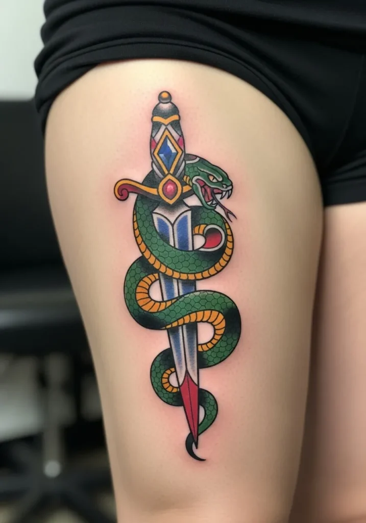 This thigh tattoo features a serpent curling tightly around a dagger, its body marked by bold green and gold scales that shimmer against the skin. The dagger s hilt is decorated with a bright red gem and intricate linework that gives it a regal touch. The clean black outlines and classic shading make the design look crisp and timeless.