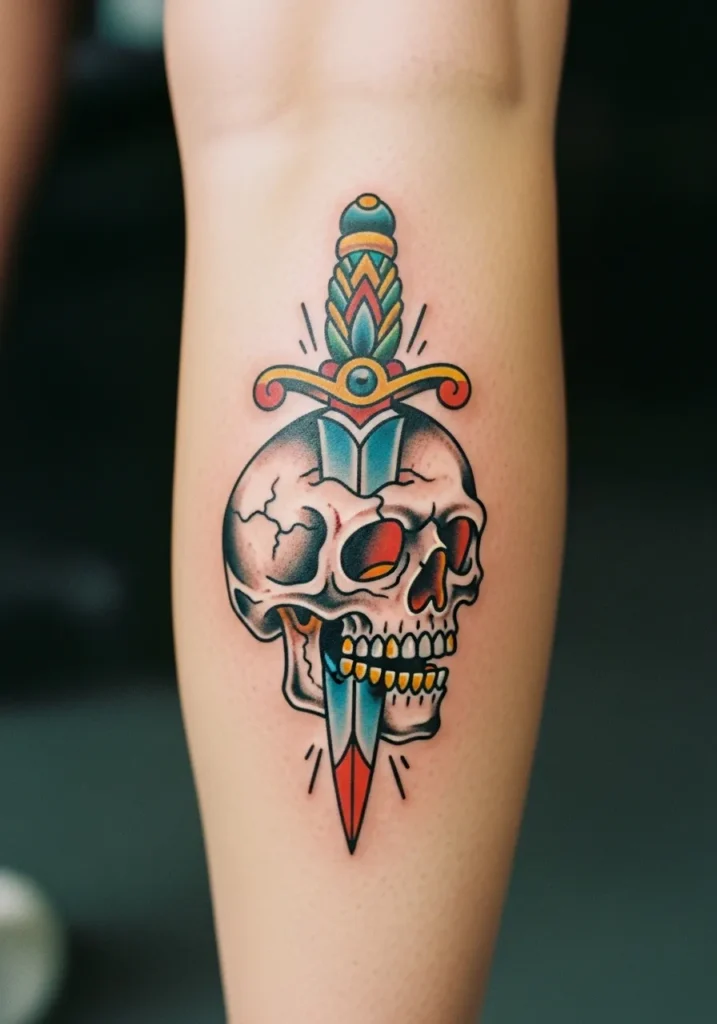 This bold American traditional tattoo sits perfectly on the calf, featuring a dagger piercing through a classic skull. The design uses vivid reds, yellows, and cool blues that contrast beautifully with the black shading around the bone structure. The golden teeth add a fun pop of brightness, giving the whole piece that signature old-school energy that stands out from every angle.