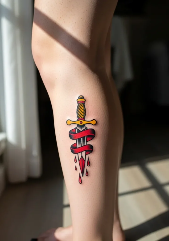This clean, minimal American traditional tattoo shows a dagger wrapped in a red ribbon, with tiny drops of blood falling from its tip. It s inked on the back of the lower leg, where the natural contours of the calf make it look even sharper. The golden hilt, deep red ribbon, and subtle black shading make the design feel bold without being overly complicated.