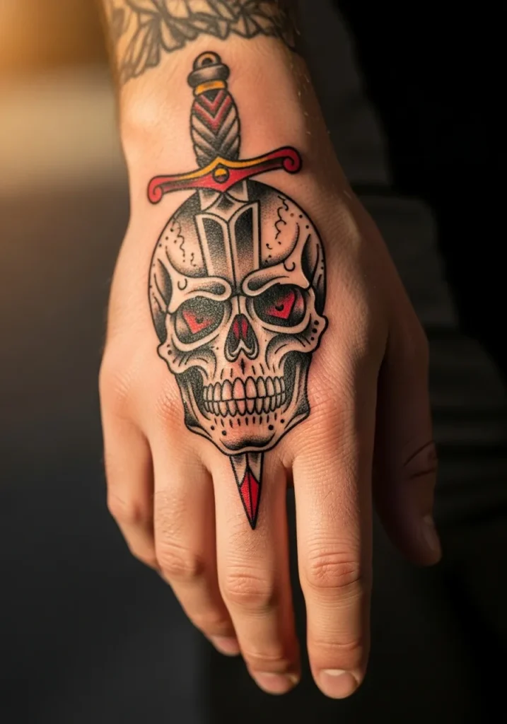 This fierce design sits on the top of the hand, showing a dagger plunged into a skull with piercing red eyes. The clean lines, heavy black shading, and deep red accents make it instantly eye-catching. It s classic American traditional unapologetically bold, perfectly balanced, and full of attitude.