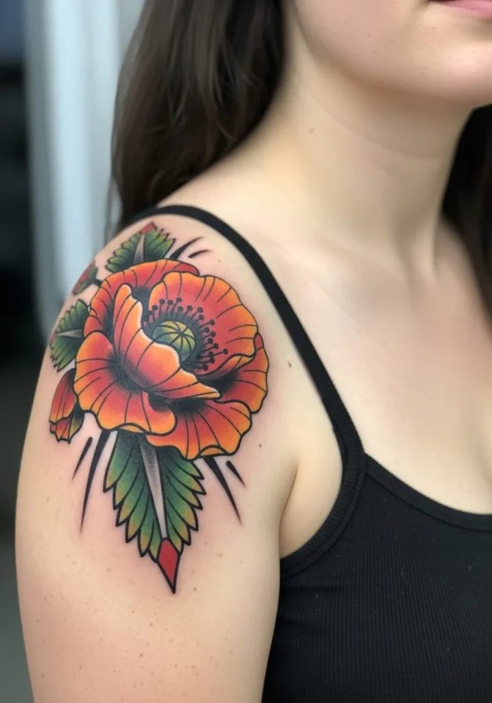 This vivid shoulder tattoo showcases a bright orange poppy surrounded by rich green leaves. The American Traditional style gives it a bold structure with black outlines and smooth shading that transitions perfectly from deep orange to golden tones. It s a strong yet graceful design that hugs the shoulder beautifully.