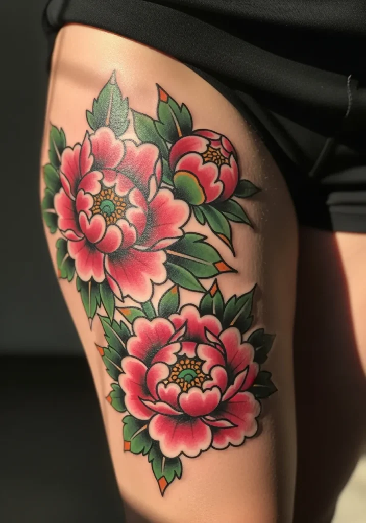 This large thigh tattoo showcases three bold American Traditional peonies bursting with pink and red hues, accented by lush green leaves. The design s strong black outlines and balanced shading give it a perfect vintage edge. It s big, colorful, and impossible to ignore just the way a peony tattoo should be.