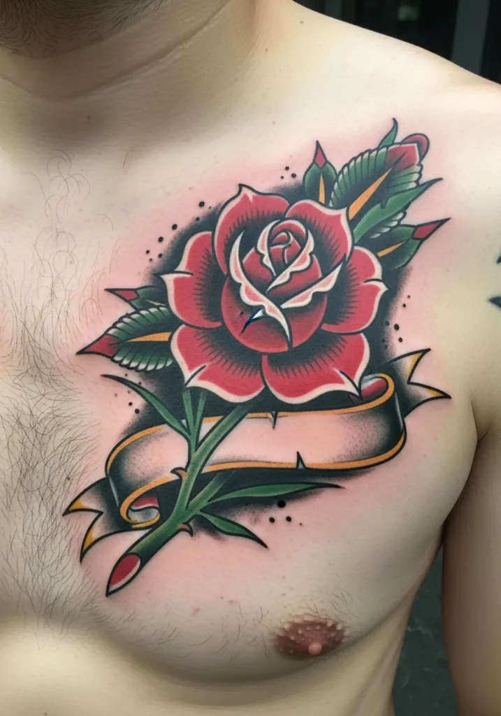 This traditional chest tattoo features a vibrant red rose with lush green leaves and a blank banner flowing beneath it. The design s crisp black lines and warm gold details give it that perfect old-school look. It s a medium-to-large piece that sits perfectly over the heart area, full of vintage charm.