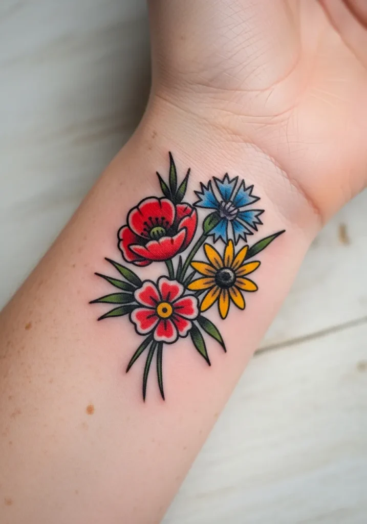 This charming wrist tattoo features a small bouquet of colorful wildflowers, including red, blue, yellow, and pink blooms. Each flower is outlined in crisp black and filled with saturated tones that make it pop beautifully. Despite its small size, it feels full of life and personality.