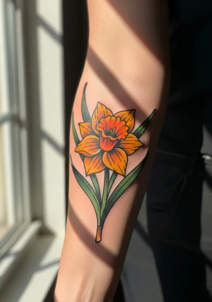 This cheerful American Traditional daffodil brightens the forearm with its bold orange and yellow petals surrounded by sleek green leaves. The clean lines and warm tones make it stand out in sunlight. It s the perfect size big enough to be noticed but not overwhelming.