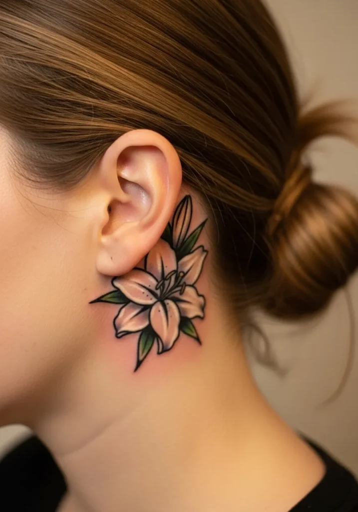 This delicate American Traditional lily blooms gracefully behind the ear, featuring soft pink petals and gentle green leaves. The compact placement makes it subtle yet stylish, and the fine detailing gives it a fresh, feminine feel.