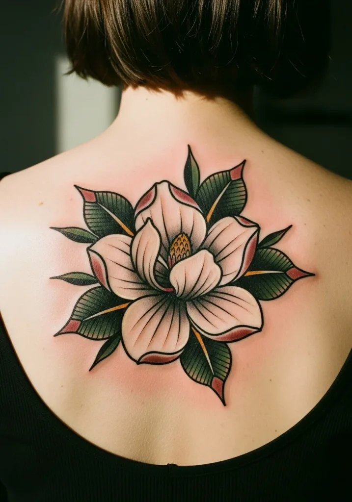 This large American Traditional magnolia tattoo rests beautifully on the upper back, its creamy white petals outlined in bold black and shaded with soft pink and beige tones. Deep green leaves fan outward, giving it structure and balance. The design s size and placement make it elegant and eye-catching, especially against the skin s natural tone.