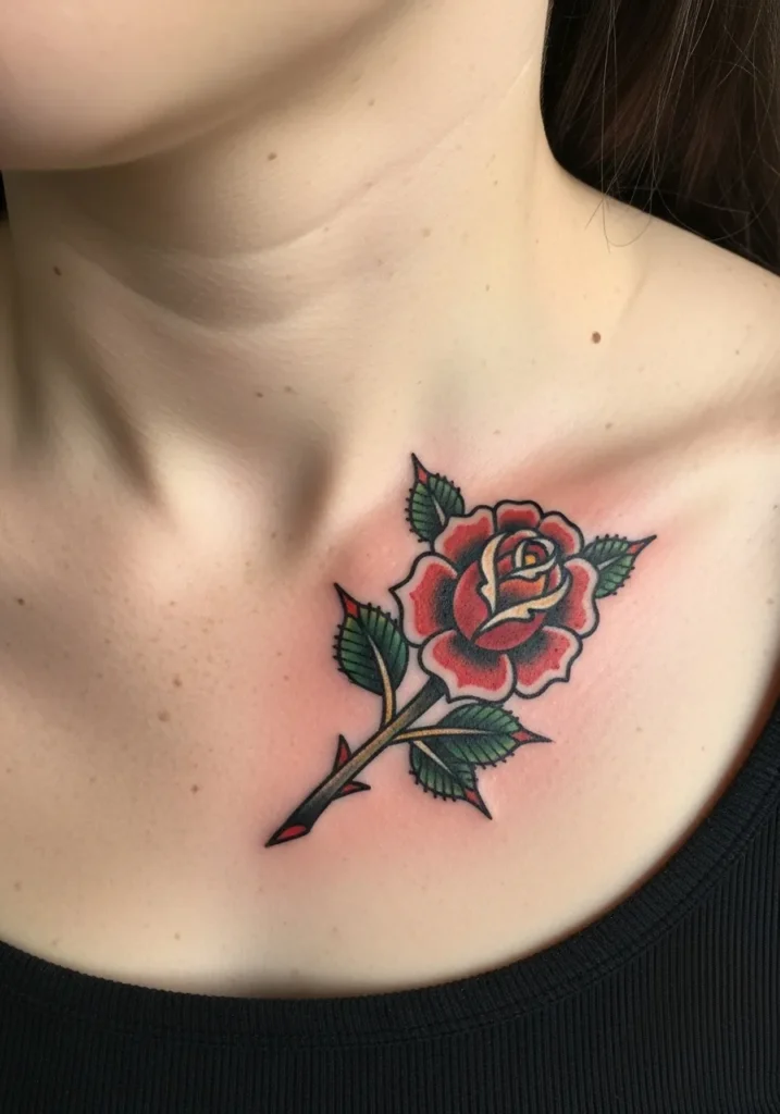 This delicate collarbone tattoo features a red American Traditional rose with crisp black outlines and small green leaves. The soft pink shading around it adds a touch of warmth. It s small but perfectly placed, adding just the right amount of charm and attitude.