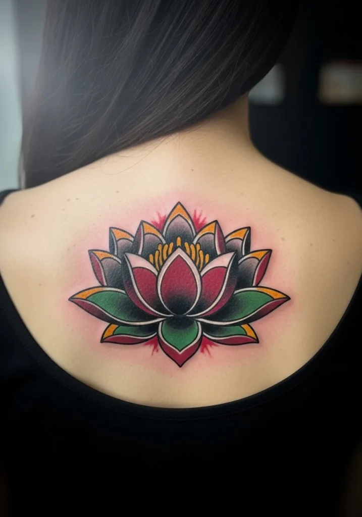 Placed gracefully between the shoulders, this American Traditional lotus tattoo glows with deep red and green petals highlighted with gold tones. The crisp black outlines and perfect symmetry give it a serene and balanced appearance. Its medium size makes it both noticeable and elegant.