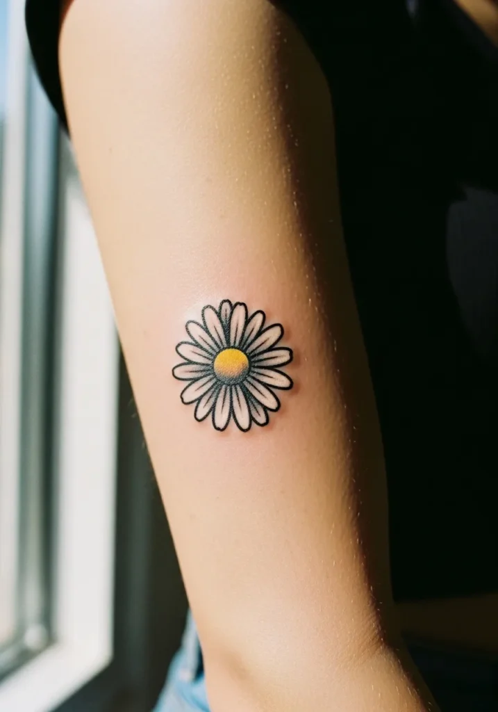 This small American Traditional daisy tattoo sits perfectly on the upper arm, framed by natural sunlight. The design features bold black outlines and clean white petals with a soft yellow center that feels cheerful and timeless. The size is petite, making it an ideal choice for anyone who loves minimal yet classic floral tattoos.