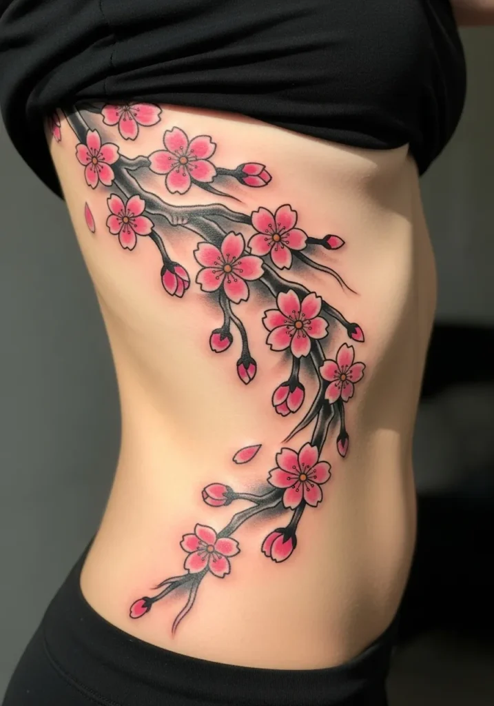 This elegant rib tattoo features soft pink cherry blossoms flowing across the skin in a graceful arc. The American Traditional shading gives depth to each flower while maintaining clean lines and balanced composition. It s large and feminine, wrapping beautifully around the body s natural curves.