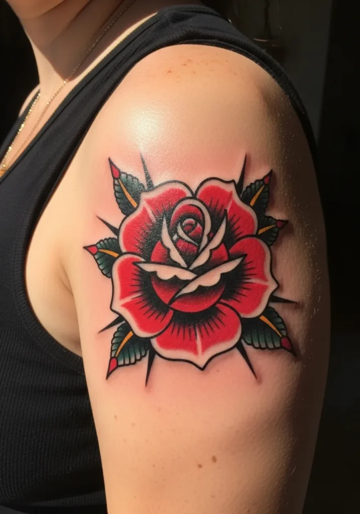 This striking American Traditional rose sits proudly on the shoulder, glowing in shades of red and white with dark green leaves. The thick black lines and clean shading make it pop beautifully. It s classic, feminine, and full of personality.
