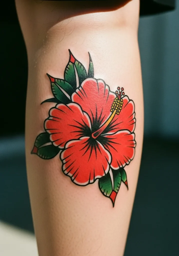 This radiant hibiscus tattoo blooms brightly on the calf, showcasing the bold lines and saturated colors typical of American Traditional style. The red petals and green leaves pop beautifully against the skin, while the yellow stamen adds a subtle tropical touch. It s the kind of design that looks both timeless and fresh.