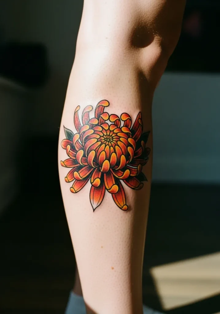 This lively chrysanthemum tattoo bursts with orange and yellow tones, its curling petals outlined in black for that perfect American Traditional definition. The flower sits beautifully on the calf, creating a rounded, full look that fits the area perfectly.