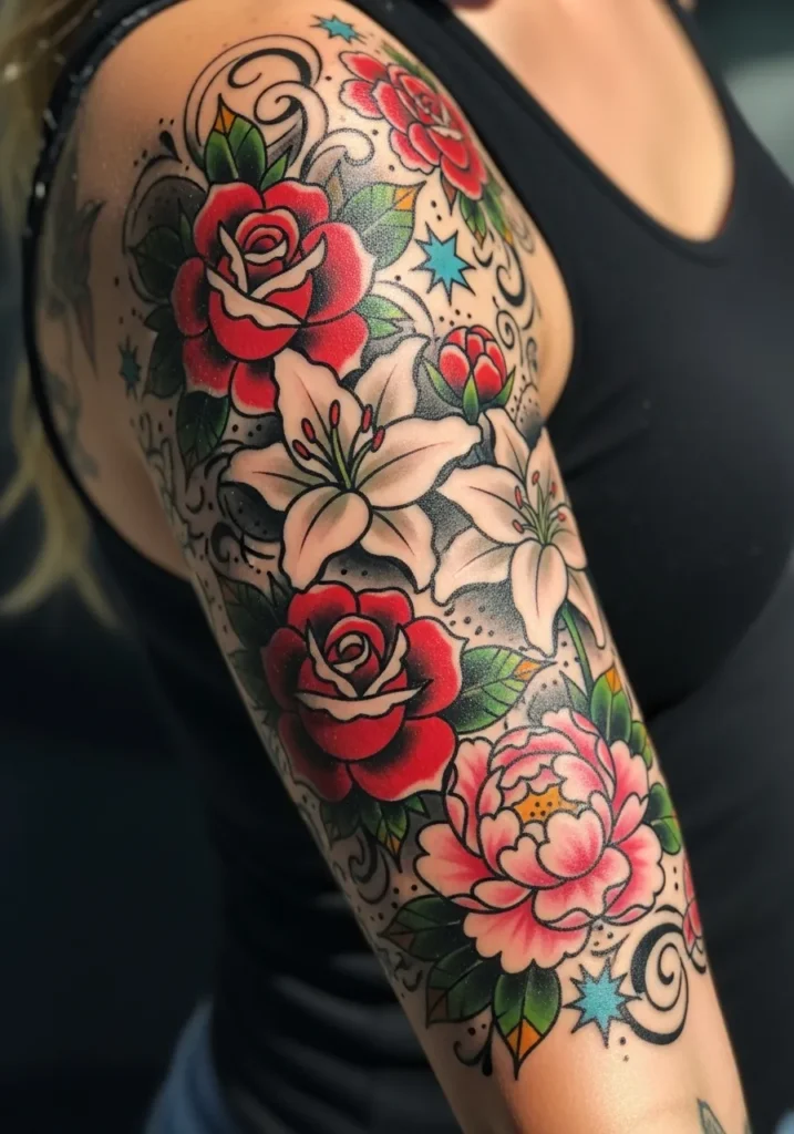 This stunning American Traditional sleeve combines red roses, white lilies, and pink peonies surrounded by green leaves and swirling filler patterns. The design covers the entire upper arm, creating a lush, colorful tapestry of blooms. Every detail, from the bold outlines to the smooth shading, feels perfectly balanced.