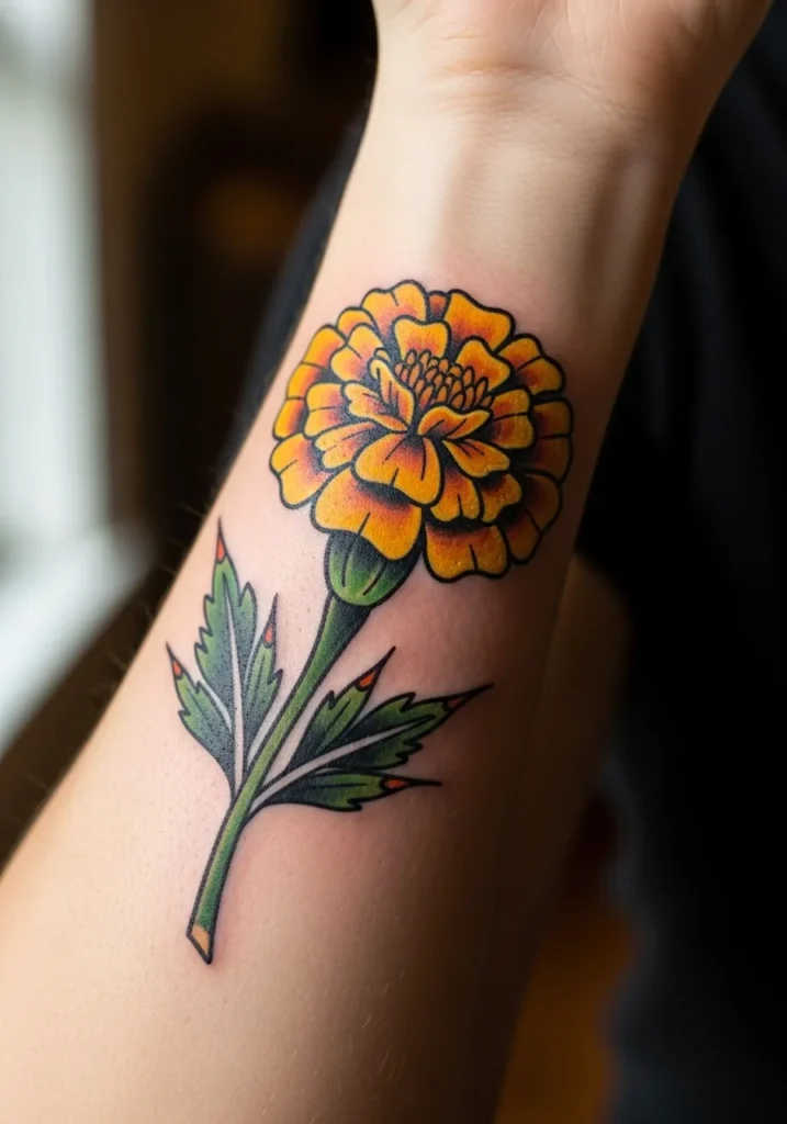 This cheerful wrist tattoo shows a single yellow marigold with layered petals and detailed green leaves. The warm golden tones are perfectly shaded, and the black outlines give it that unmistakable American Traditional sharpness. It s bright, sunny, and full of personality.